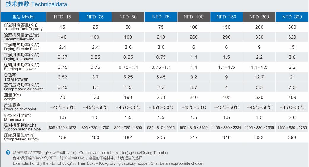 例如:欲干燥 80kg/hr 的 PET,則 ND-300 即為適當(dāng)?shù)倪x擇