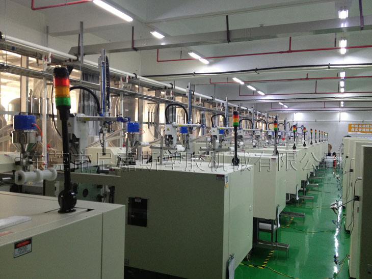 中央供料系統(tǒng)是根據(jù)客戶現(xiàn)場(chǎng)機(jī)臺(tái)的擺放情況對(duì)現(xiàn)場(chǎng)原料的用料情況,結(jié)合特有輔機(jī)設(shè)計(jì)備而設(shè)計(jì)的一種能夠?qū)崿F(xiàn)集中供料、集中控制,從而實(shí)現(xiàn)全廠無(wú)人化不間斷成型作業(yè)的整體性解決方案。